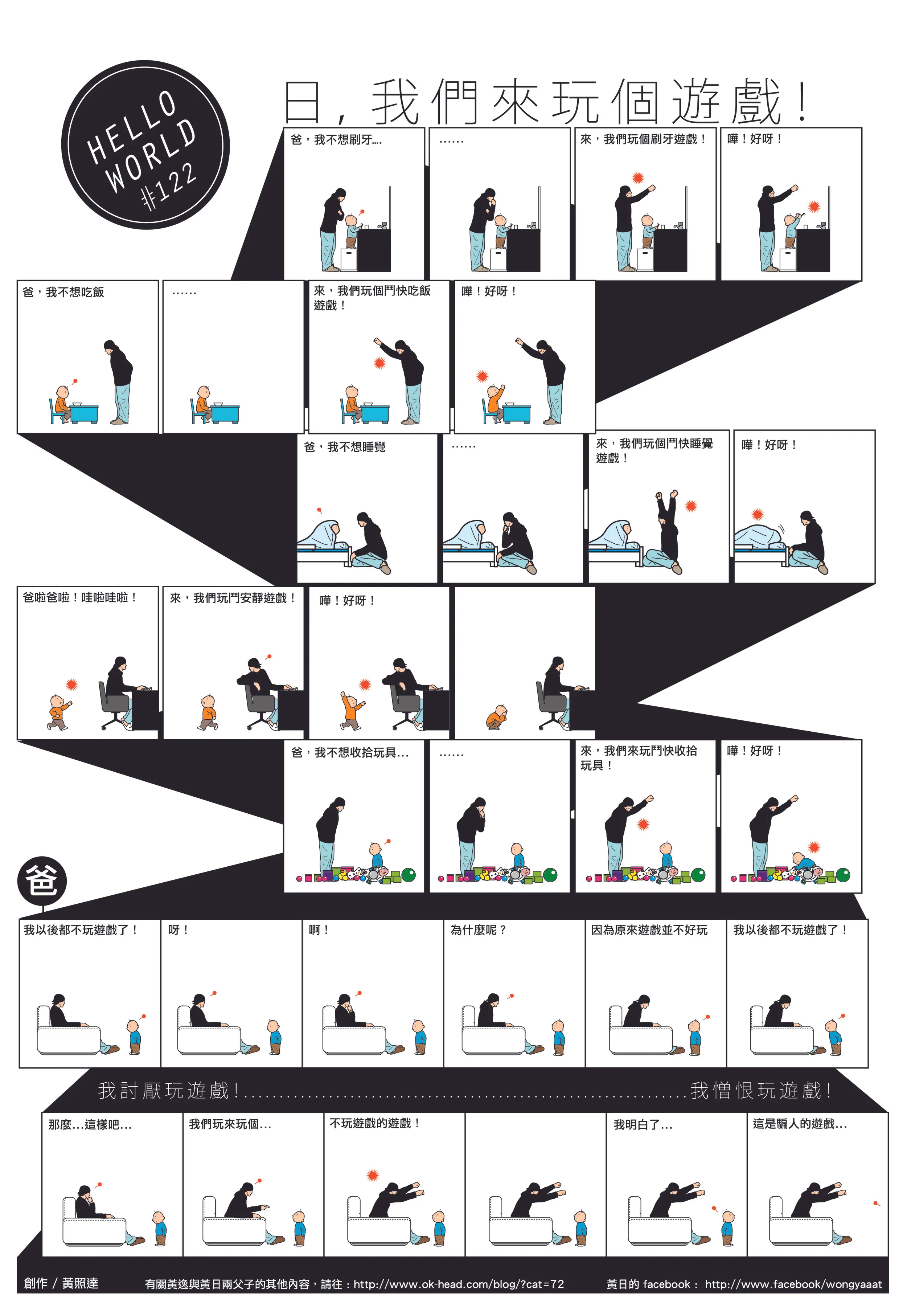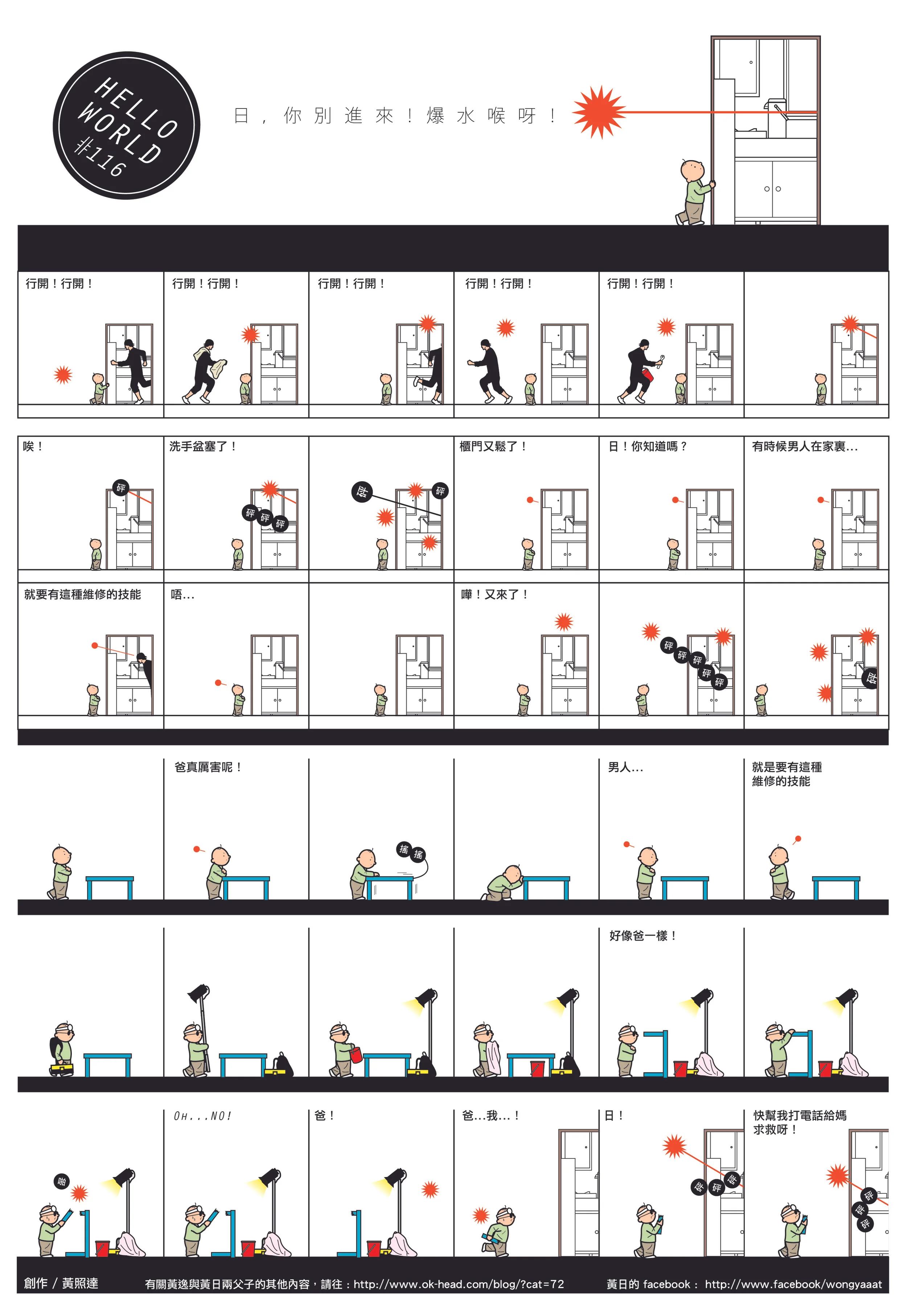 Hello World is a father-and-son story inspired by the artist's own experience when he became a father in 2009. It was originally published in the newspaper Ming Pao Daily between 2011-15.