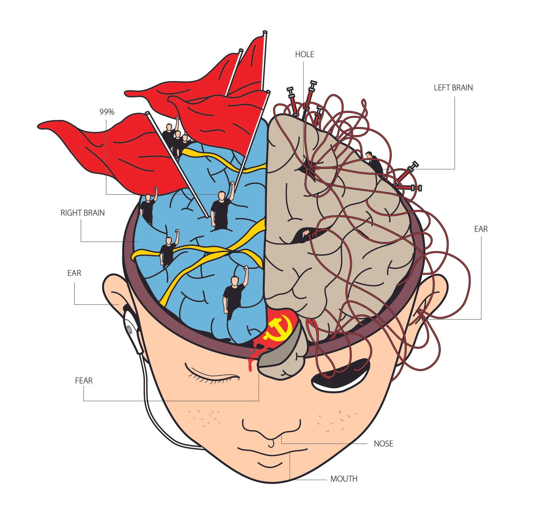 Illustration of human heads wearing sunglasses with guns, microphones, and wires protruding from their heads, connected to a printing press with human figures pulling on cords. View fullsize
