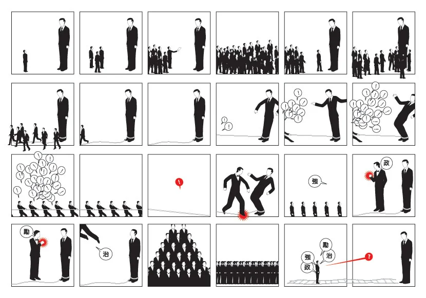 A cartoon illustration depicting a complex pyramid of construction cranes with businesspeople, a boxer, and humorous elements, including a pool with a person falling in, palm trees, and bottles. View fullsize