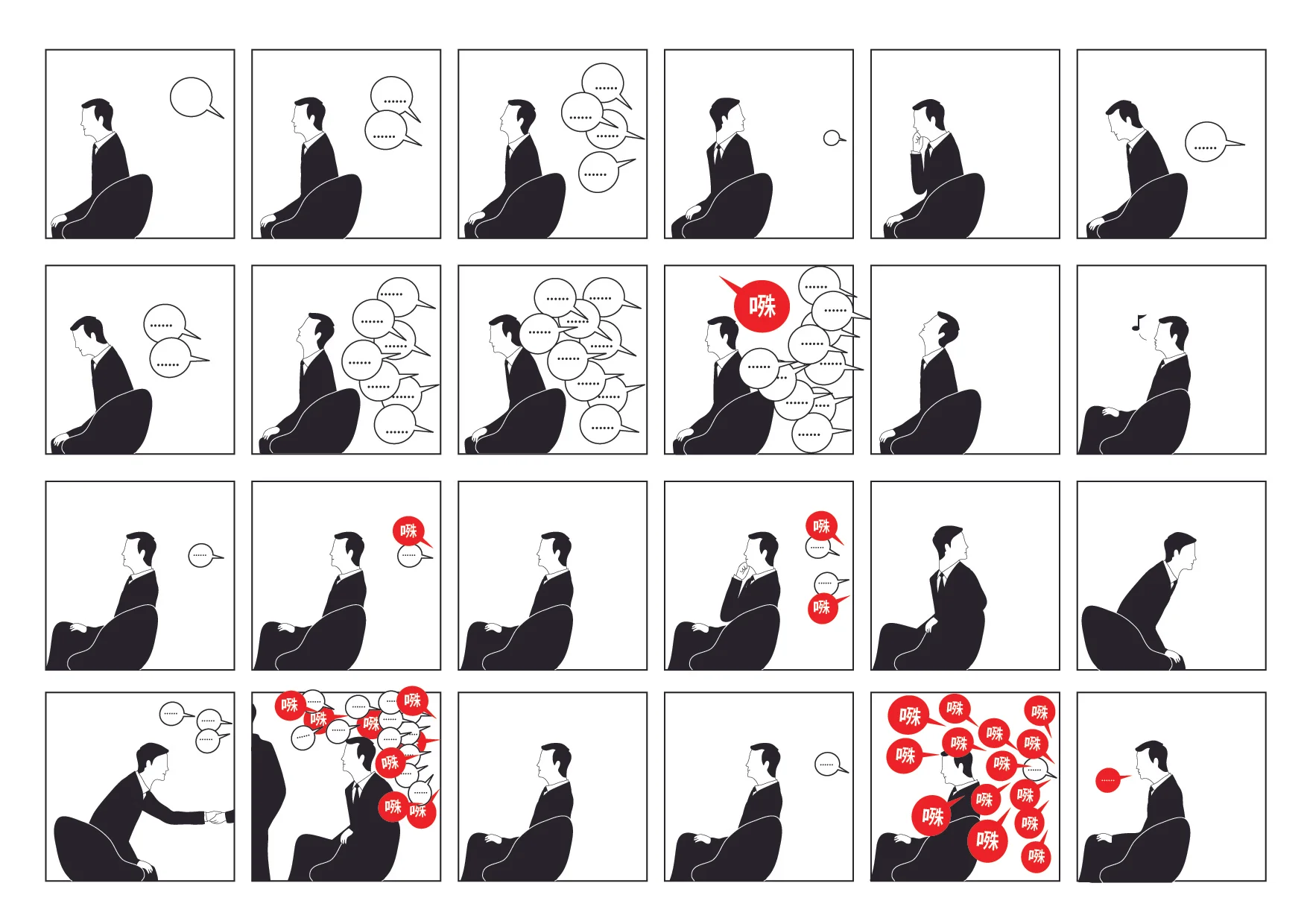 Comic-style illustration of a person holding a microphone and pointing to a blank outline in the air, with another person crouching next to an alpaca, set on a stage with colorful chairs and two people at podiums. View fullsize