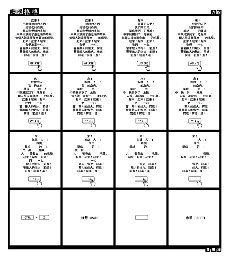 Grid of illuminated red signs with Chinese characters and icons, each with a different message or symbol related to Hong Kong and local culture, arranged in three columns and four rows. View fullsize
