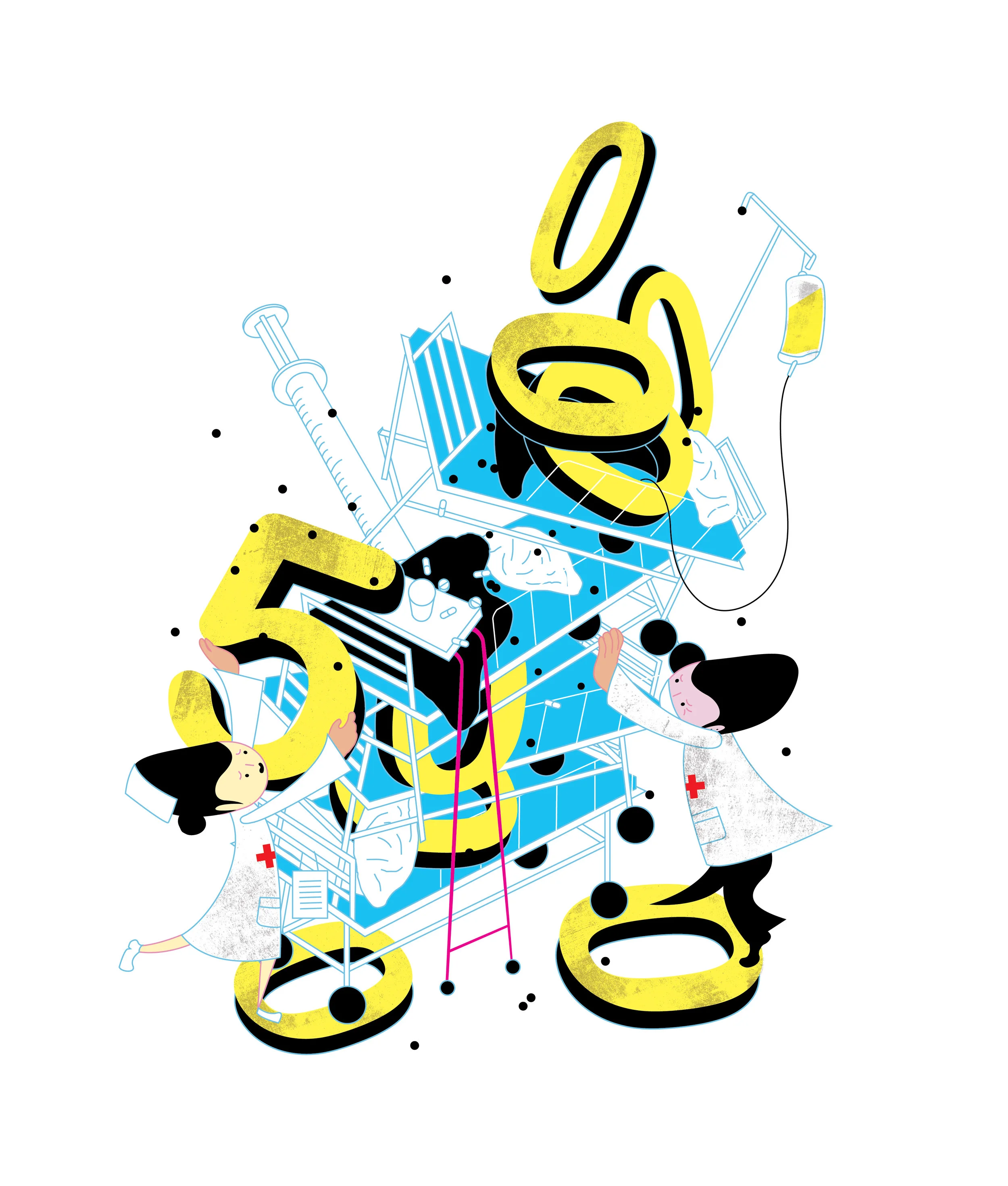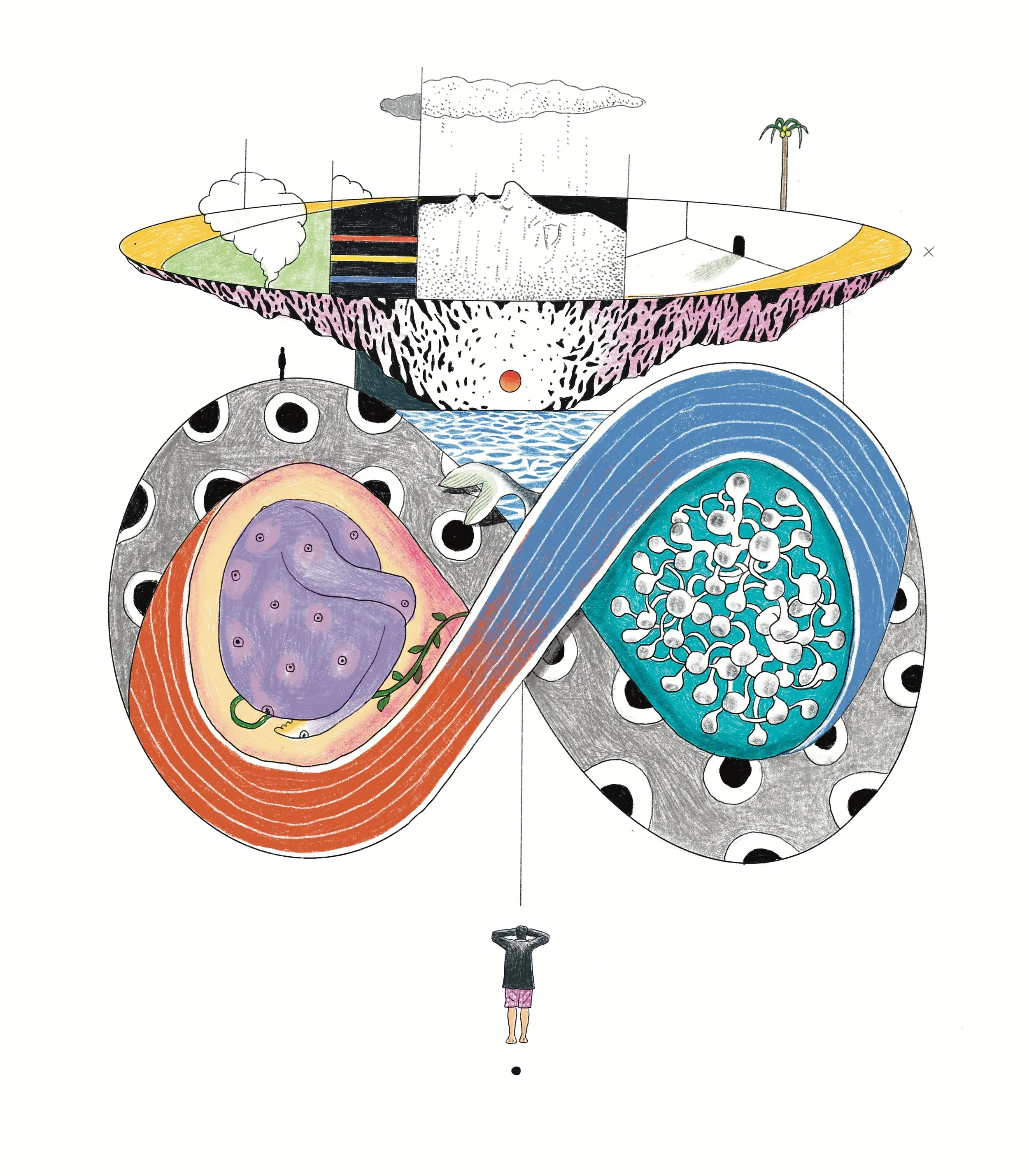 A cartoon illustration depicting a complex pyramid of construction cranes with businesspeople, a boxer, and humorous elements, including a pool with a person falling in, palm trees, and bottles.